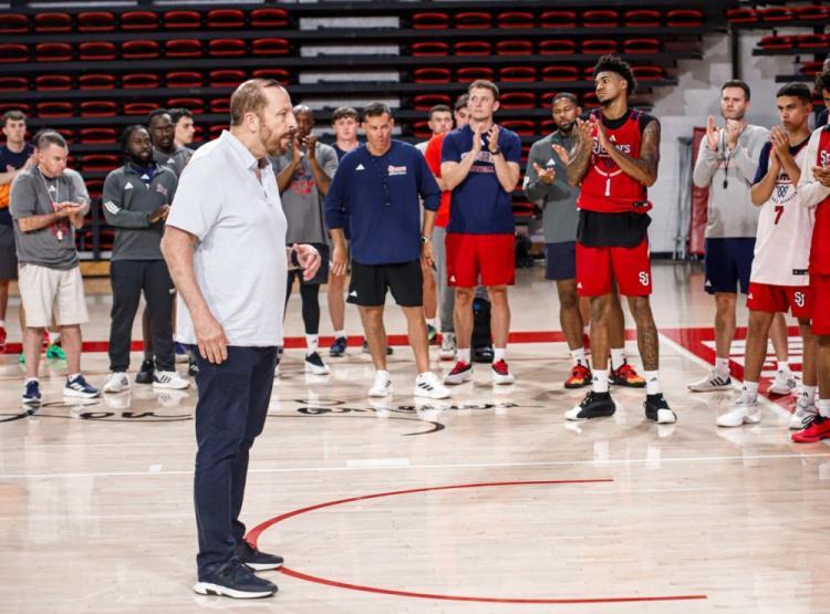 雷速体育9月5日讯 今日,圣约翰大学男篮官方晒出了锡伯杜指导球员的照片,并写道:“感谢汤姆·锡伯杜本周来访训练场欄!”